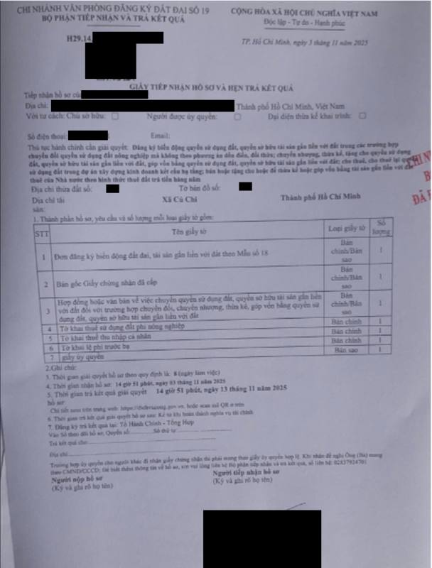 Bước 5: Sau khi hoàn thành các nghĩa vụ tài chính, người đi làm thủ tục mang biên lai đến nơi nộp hồ sơ ban đầu để nhận lại Giấy chứng nhận quyền sử dụng đất đã được sang tên đổi chủ.